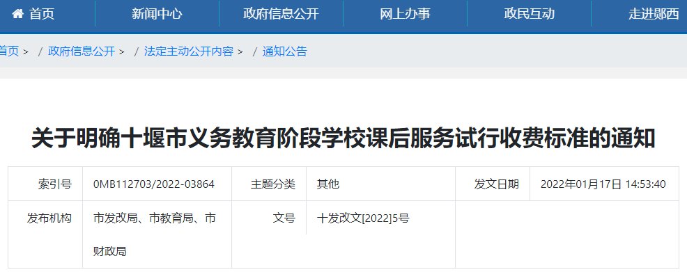 市发改局、市教育局、市财政局确定了十堰市义务教育阶段学校课后服务试行收费标准,试行期二年。标准如下: