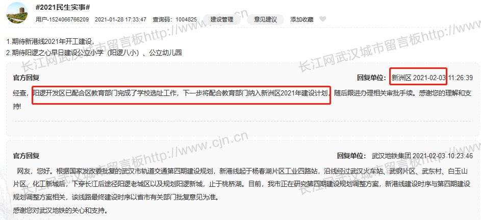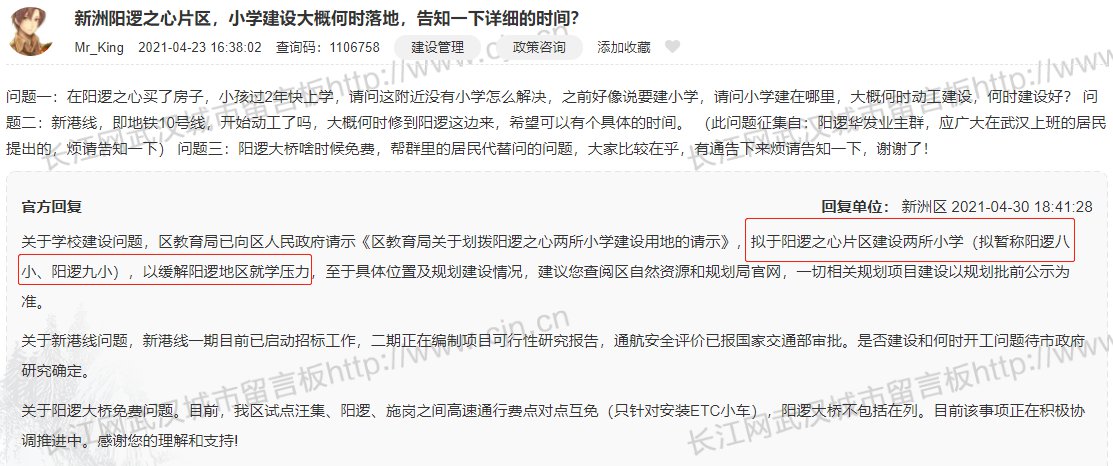 有居民在武汉城市留言板上咨询新洲区阳逻八小建设进展情况,官方进行了回复。