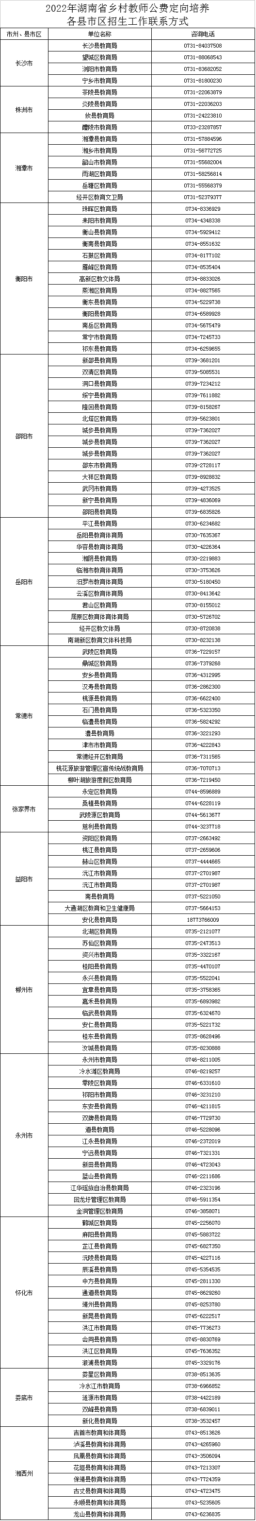 2022年湖南省乡村教师公费定向培养各县市区招生工作联系方式