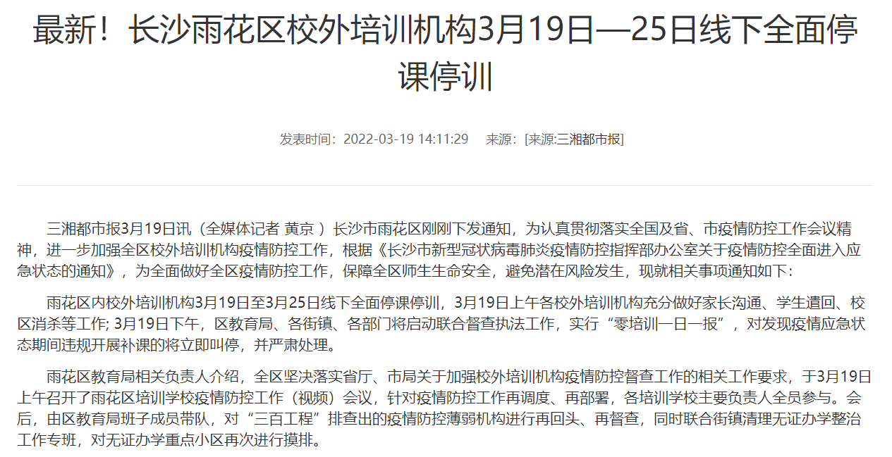 雨花区内校外培训机构3月19日至3月25日线下全面停课停训。
