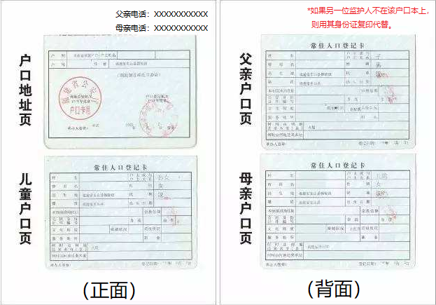 复印件复印要求:A4纸正面(上)户主页、(下)适龄儿童页;背面(上)爸爸页、(下)妈妈页,并在正面右上角写上父母双方的联系电话。