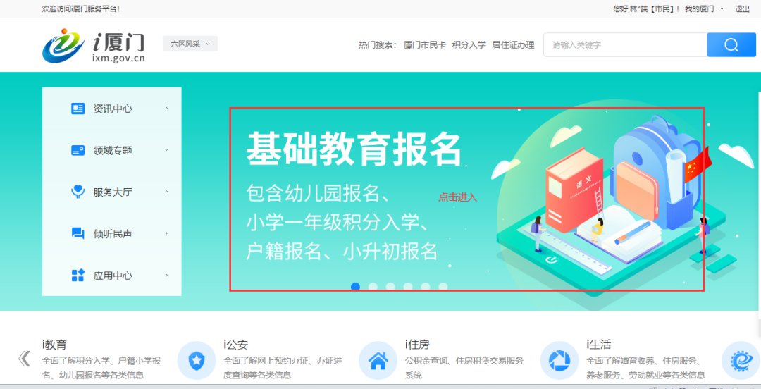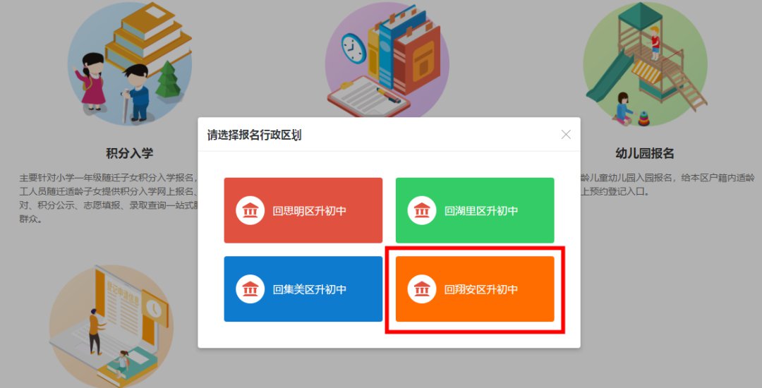 登录i厦门之后在首页找到“基础教育报名”板块点击进入,然后点击“回户籍地升初中”再选择“回翔安区升初中”。注意选择正确的区填报。