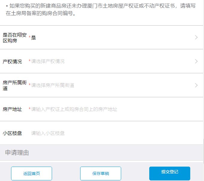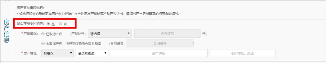 如果在翔安区没有购房,点选“否”即可,如果有购房,点选“是”,并根据自己的房产情况填写相对应的房产信息。