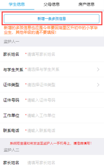 3.如果申请回户籍地的学生信息不止一个,可以点击“新增一条多孩信息”,新增的多孩信息也应是今年要回湖里区升初中的小学毕业生,其他年级不要添加。新增的学生需完整填写基本信息和受教育情况。特别提醒:华侨、外籍适龄儿童需要选择国籍。