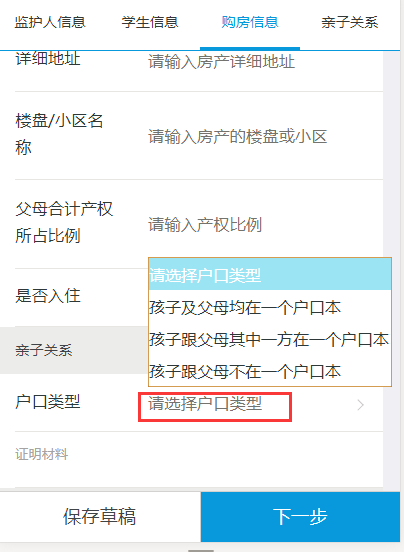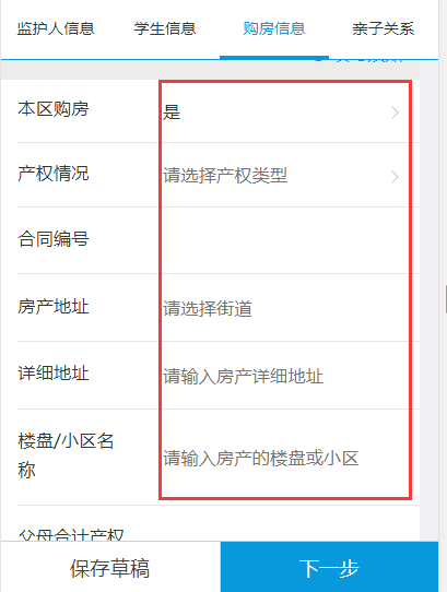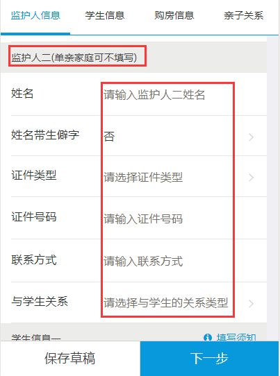 网上报名登记内容包括监护人信息、学生信息、购房信息、亲子关系四项信息(图9)。请根据实际情况填写。