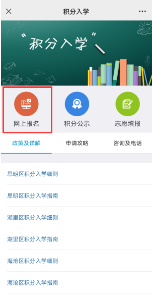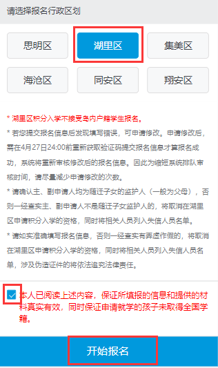 2.报名起止时间为:2022年4月18日至2022年4月27日,请需要报名的学生家长务必在4月27日24:00之前填写信息并获取验证码提交报名信息,否则即视为自愿放弃在湖里区参加积分入学的资格。