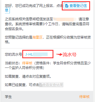 认真阅读下方红色字体的诚信保证内容并勾选(图20)。点击“获取验证码”,将收到的短信验证码输入方框内,然后点击“提交报名”,进入审核情况界面,即本次报名成功。报名成功后,系统会生成一个唯一的流水号,家长后期可以登录系统查看所填信息的审核状态情况(图21)。