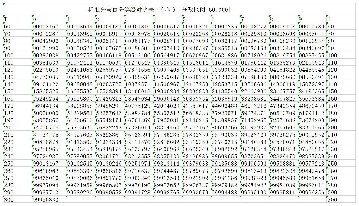 根据标准正态分布常模量表,依照转换公式Ti=180+30×Zi,建立《标准分与百分等级对照表(单科)-分数区间[60,300]》。