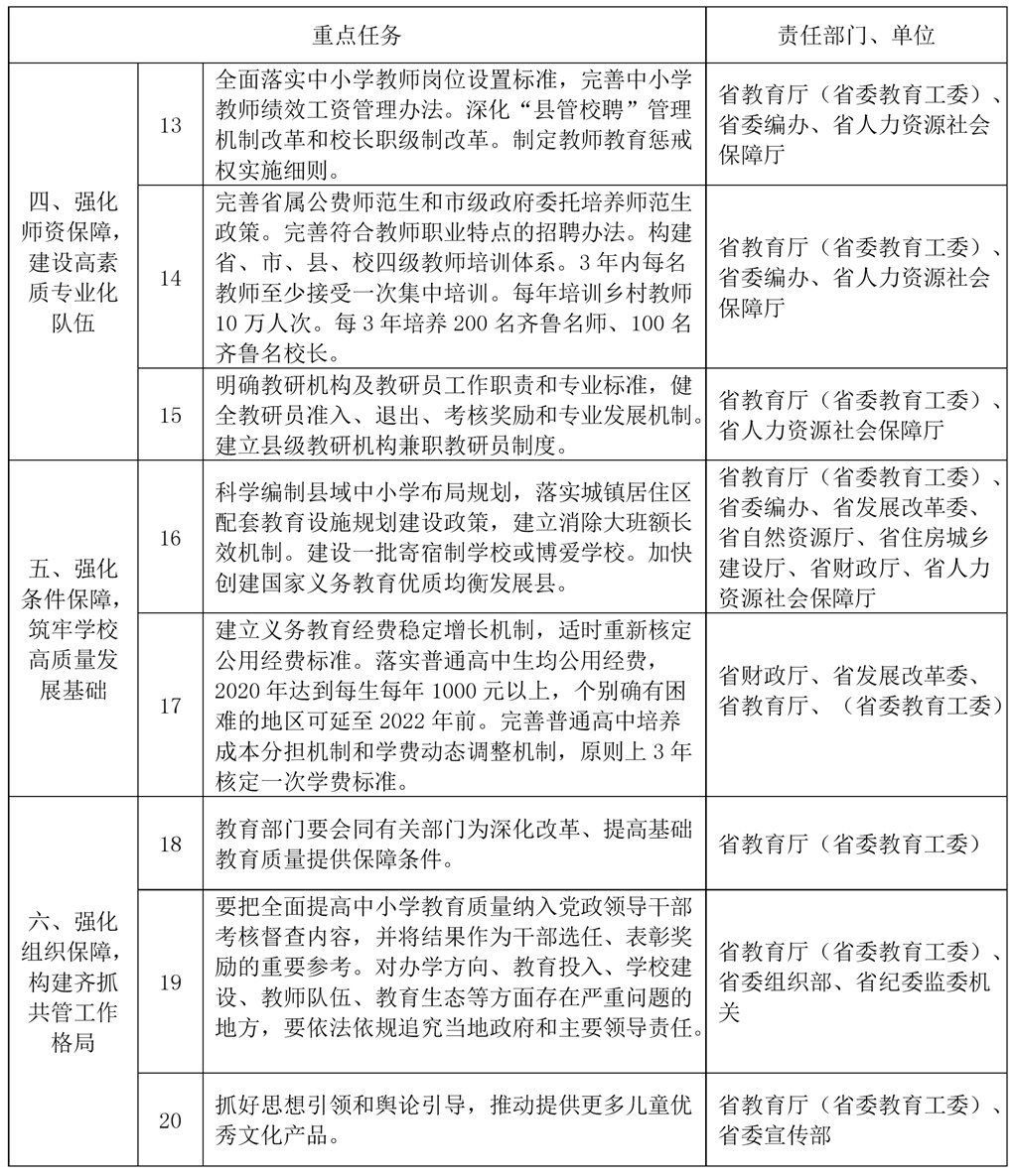 (十九)营造良好环境。各级各部门要切实履行职责,齐抓共管,抓好思想引领和舆论引导,推动提供更多儿童优秀文化产品。加强校园及周边综合治理,维护校园正常秩序和师生合法权益,为深化教育教学改革、提高基础教育质量营造教书育人良好氛围。