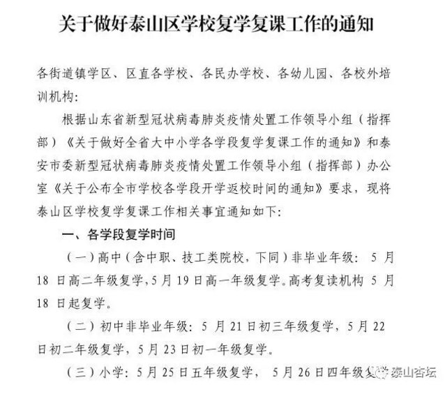 (一)高中(含中职、技工类院校,下同)非毕业年级:5月18日高二年级复学,5月19日高一年级复学。高考复读机构5月18日起复学。