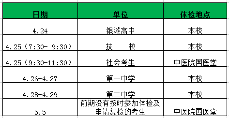 根据疫情防控要求和服务考生的原则,由体检站使用体检车分别进入各高中段学校,考生在校就可完成所有体检项目。社会考生安排在市中医院体检。