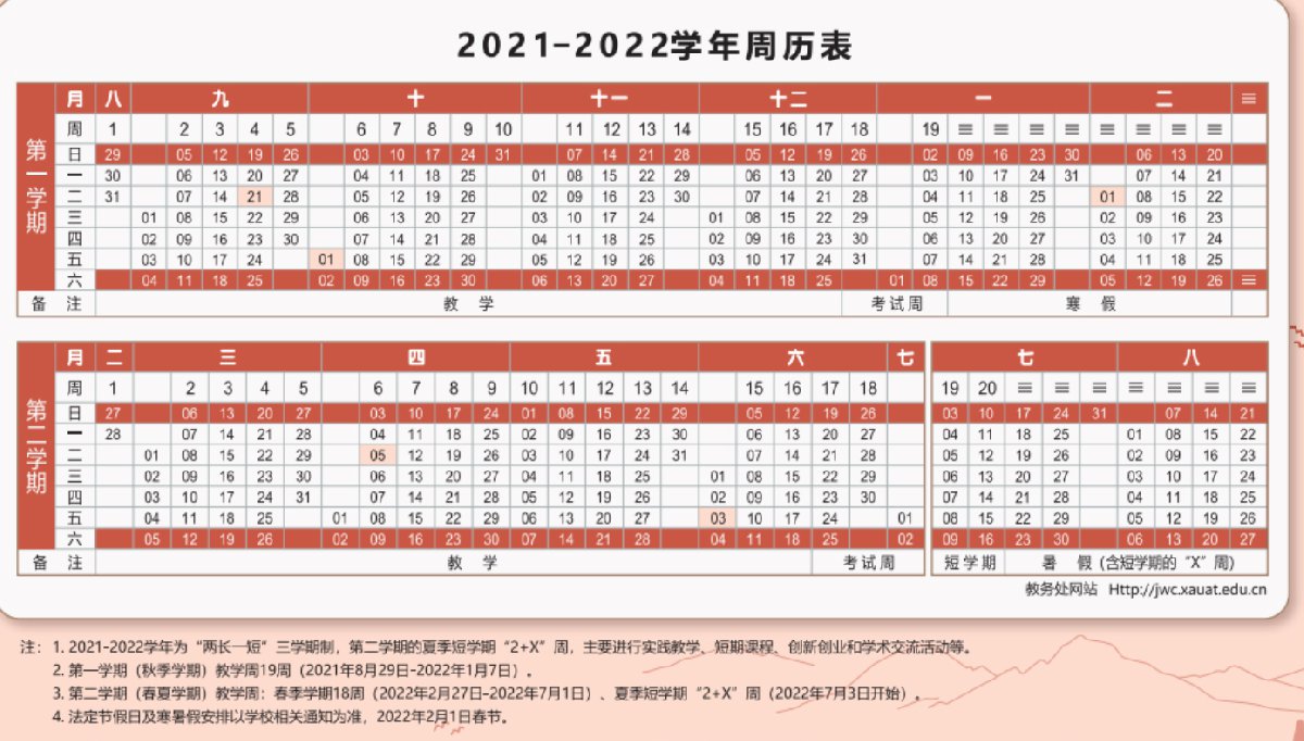 西安建筑科技大学校历显示,秋冬季学期结束日期为:2022年1月7日;春夏季开学时间为:2022年2月27日
