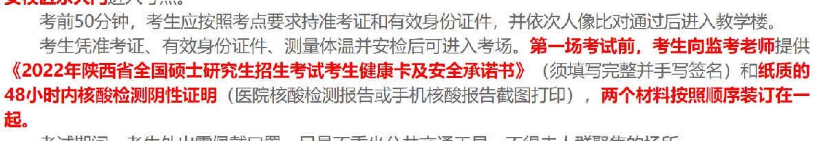 考生凭准考证、有效身份证件、测量体温并安检后可进入考场。第一场考试前,考生向监考老师提供《2022年陕西省全国硕士研究生招生考试考生健康卡及安全承诺书》(须填写完整并手写签名)和纸质的48小时内核酸检测阴性证明(医院核酸检测报告或手机核酸报告截图打印),两个材料按照顺序装订在一起。