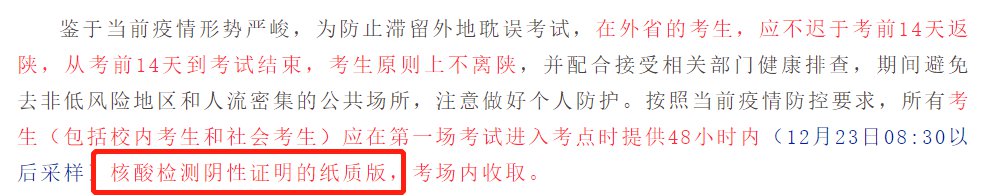 鉴于当前疫情形势严峻,为防止滞留外地耽误考试,在外省的考生,应不迟于考前14天返陕,从考前14天到考试结束,考生原则上不离陕,并配合接受相关部门健康排查,期间避免去非低风险地区和人流密集的公共场所,注意做好个人防护。按照当前疫情防控要求,所有考生(包括校内考生和社会考生)应在第一场考试进入考点时提供48小时内(12月23日08:30以后采样)核酸检测阴性证明的纸质版,考场内收取。