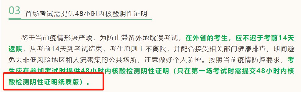 鉴于当前疫情形势严峻,为防止滞留外地耽误考试,在外省的考生,应不迟于考前14天返陕,从考前14天到考试结束,考生原则上不离陕,并配合接受相关部门健康排查,期间避免去非低风险地区和人流密集的公共场所,注意做好个人防护。按照当前疫情防控要求,考生应在规定时间到省内专业检测机构进行核酸检测,并在进入考点时提供打印的48小时内核酸检测阴性证明(纸质版)【采样时间须为12月23日8:00(含)以后】(下同),以便进入考点和考场进行查验留存。