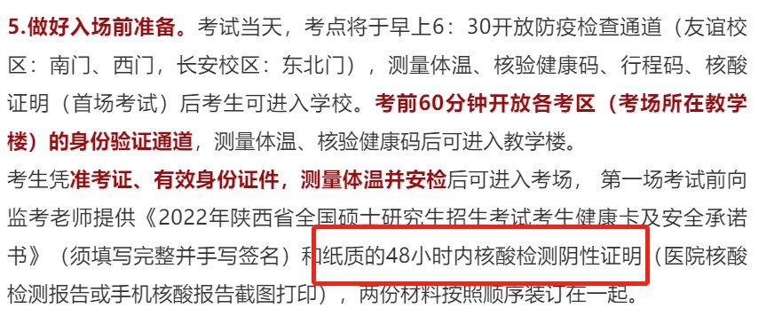 所有考生凭准考证、有效身份证件,测量体温并安检后可进入考场,第一场考试前向监考老师提供《2022年陕西省全国硕士研究生招生考试考生健康卡及安全承诺书》(须填写完整并手写签名)和纸质的48小时内核酸检测阴性证明(医院核酸检测报告或手机核酸报告截图打印),两份材料按照顺序装订在一起。