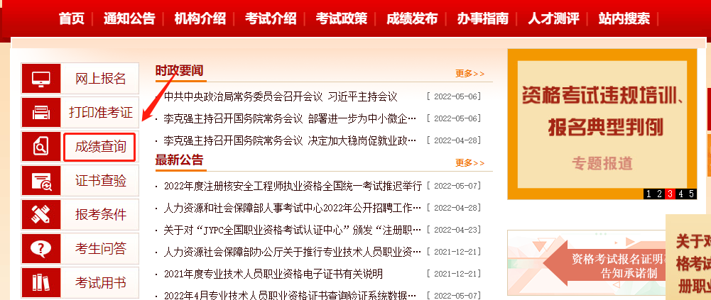进入中国人事考试网网站首页,点击左侧:成绩查询;
