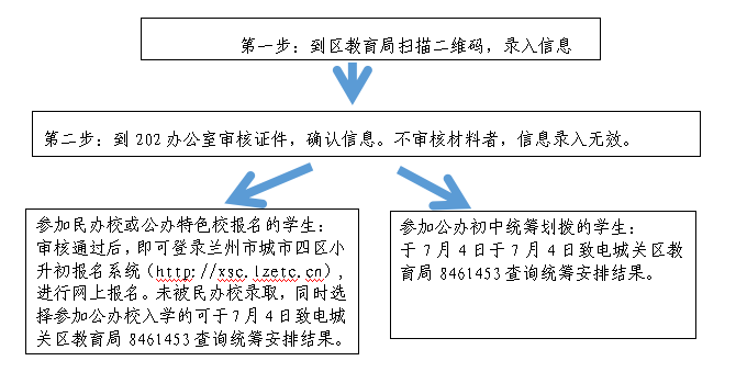 审核通过后,即可登录兰州市城市四区小升初报名系统(http://xsc.lzetc.cn),进行网上报名。未被民办校录取,同时选择参加公办校入学的可于7月4日致电城关区教育局8461453查询统筹安排结果。