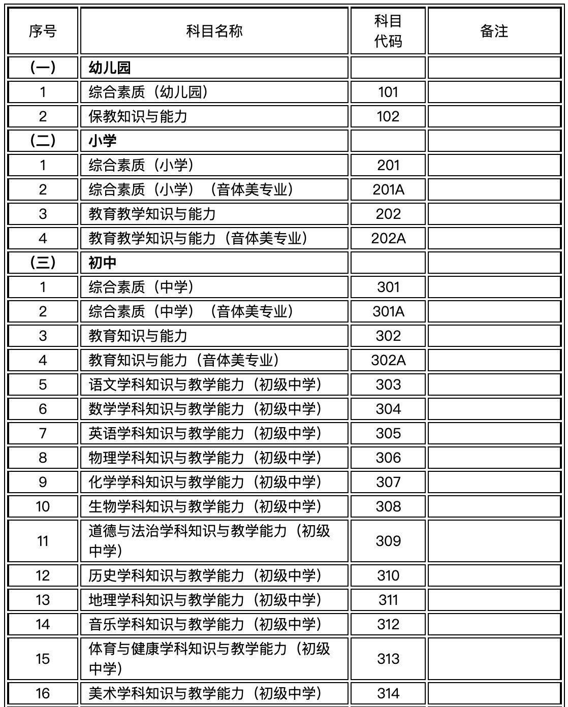 1.为完善中小学教师资格考试制度设置,加强中小学音、体、美专业教师队伍建设,从2017年下半年考试开始,对音、体、美专业考生的笔试公共科目一、科目二(科目代码:201、202、301、302)实行单独编码(相应科目代码:201A、202A、301A、302A),考试内容暂与原科目相同。实行单独编码后,音、体、美专业考生在笔试报名时应选报单独编码的公共科目。取得科目201A、202A合格的考生,面试仅限于参加小学类别音、体、美专业科目;取得科目301A、302A合格的考生,面试仅限于参加初中、高中、中职文化课音、体、美专业科目。考生已获得科目201、202、301、302合格成绩,可相应替代科目201A、202A、301A、302A合格成绩;考生已获得科目201A、202A、301A、302A合格成绩不可替代科目201、202、301、302合格成绩。