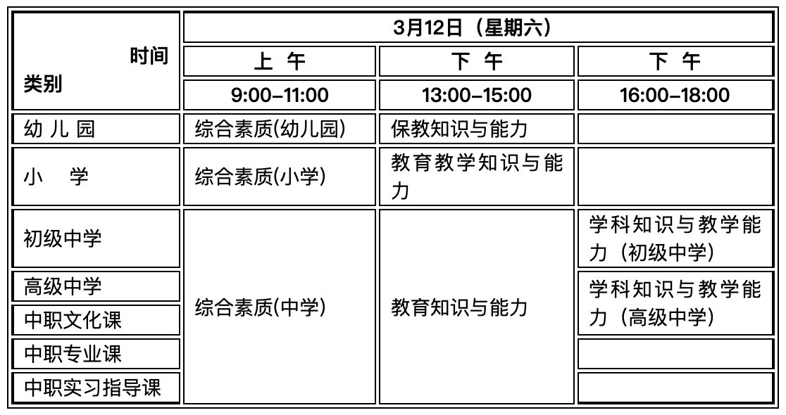 2022年上半年NTCE笔试日期为3月12日,各科目考试时间为120分钟,具体日程安排如下表:
