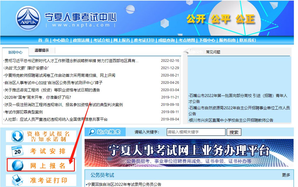1.进入报名系统。点击宁夏人事考试中心网首页“网上报名”后,选择“宁夏2022年考试录用公务员”。