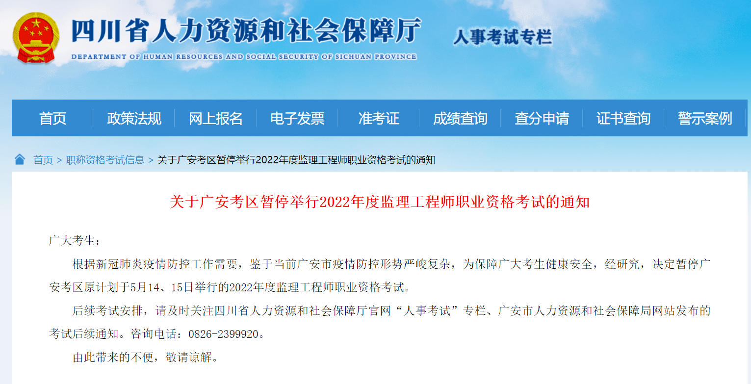 关于广安考区暂停举行2022年度监理工程师职业资格考试的通知