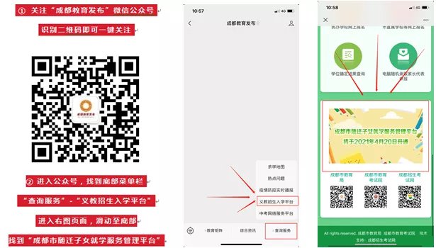 4月20日至5月20日,家长可以关注微信公众号“成都教育发布”,点击菜单栏“查询服务”中的“成都市义务教育招生入学服务平台”进入“成都市随迁子女就学服务管理平台”注册、登录后,按要求填写相关信息,上传相关资料,提交入学申请。