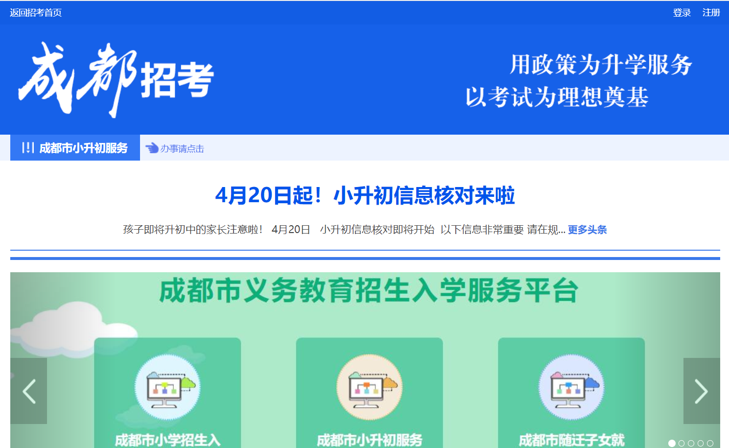 网址https://www.cdzk.com,点击“义务教育招生入学服务平台”,进入成都市小升初服务平台注册登录“成都招考”,完成个人信息采集。