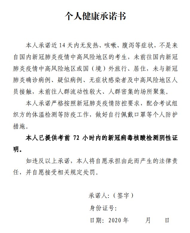 (五)考生应仔细阅读本告知书,知悉告知事项、证明义务和防疫要求,自愿承担因不实承诺应承担的相关责任、接受相应处理。凡隐瞒或谎报旅居史、接触史、健康状况等疫情防控重点信息,不配合工作人员进行防疫检测、询问等造成不良后果的,取消其考试资格,终止考试。如有违法行为,将依法追究其法律责任。