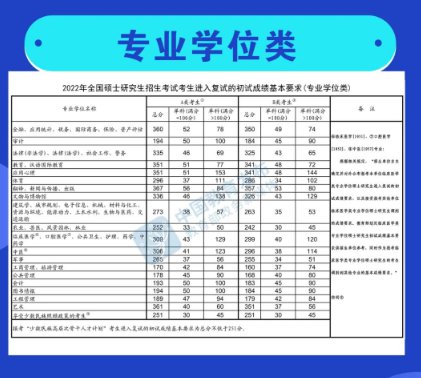 同日,教育部发布了《2022年全国硕士研究生招生考试考生进入复试的初试成绩基本要求》(国家分数线)。各招生单位将根据《2022年全国硕士研究生招生工作管理规定》,在国家分数线的基础上,自主确定并公布本单位各专业考生进入复试的要求。