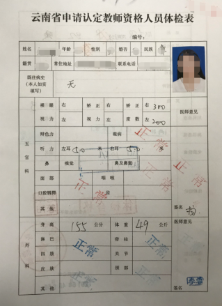 体检结论栏签署“体检合格”且有体检医院意见并加盖公章的《云南省教师资格认定体检表》原件,体检报告仅限当次认定有效。有关事项为: