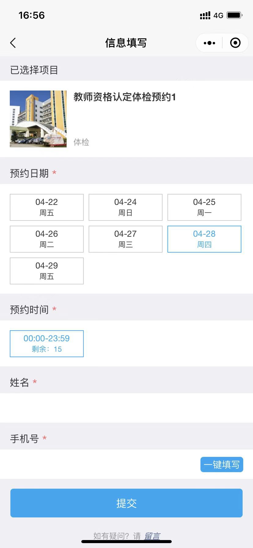 第四步:选择预约日期、预约时间、输入个人信息点击提交