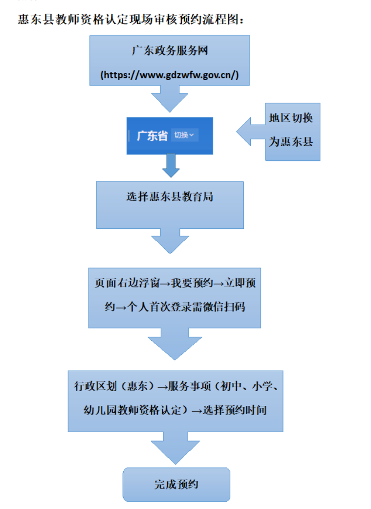 前往现场审核前,申请人请按《申请认定教师资格现场审核预约流程图》(见下图)预约。