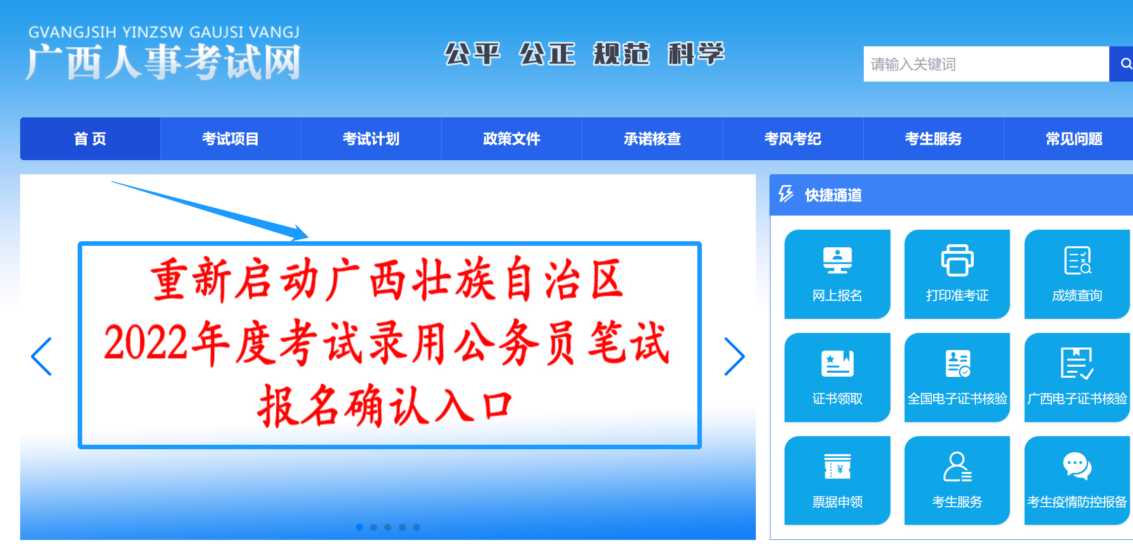 ①登录广西人事考试网,点击首页“重新启动广西壮族自治区2022年度考试录用公务员笔试报名确认入口”。