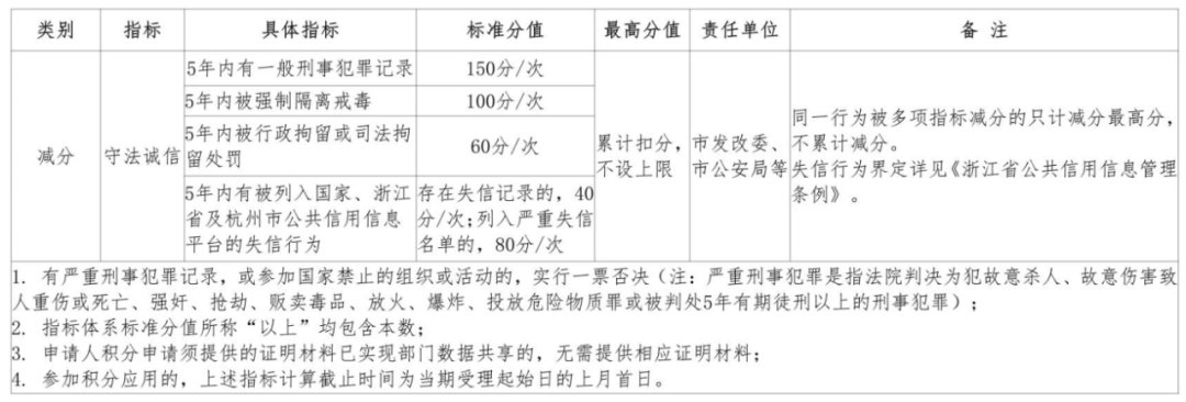 居住证积分管理指标体系由基础分指标、加分指标、减分指标和一票否决指标组成。基础分指标包括年龄、就业及参加社保、住所及居住年限、文化程度、专业技术职称或技能水平等;加分指标包括奖项荣誉、社会服务、投资纳税、科技创新等;减分指标包括刑事犯罪、行政拘留、违反计划生育政策、个人不良信用记录等;一票否决指标是指有严重刑事犯罪记录和参加国家禁止的组织或活动的行为。