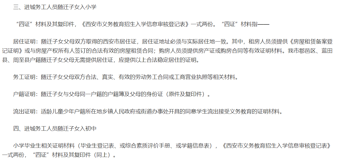 我市鄠邑区、周至县、蓝田县户籍随迁子女由其父母或法定监护人持“四证”材料(其中居住类证明材料为:在我区城区合法稳定居住的有关证明材料),参照进城务工人员随迁子女流程申请、办理。
