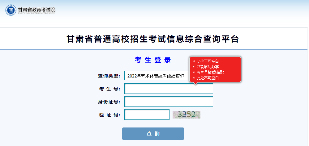 (一)登录甘肃省教育考试院网站https://www.ganseea.cn,点击网页右上角“考生查询”栏目或在浏览器地址栏直接输入网址https://gaokao.ganseea.cn,输入考生号、身份证号进行查询。