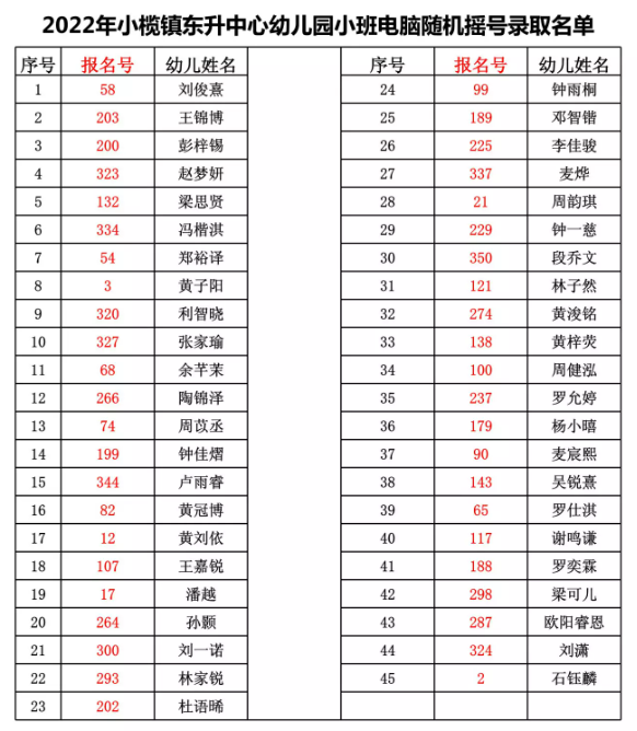 2022年小榄镇东升中心幼儿园小班电脑随机摇号录取名单及符合片区优先录取名单