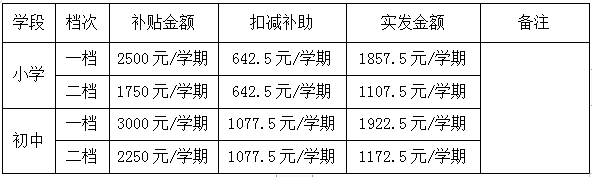 一档学位补贴标准:小学每生每学年5000元,初中每生每学年6000元;二档学位补贴标准:小学每生每学年3500元,初中每生每学年4500元(以上标准均含免费义务教育公用经费补助和免费义务教育教科书补助“小学642.5元/生/学期,初中1077.5元/生/学期”)。小学、初中一档、二档学位补贴实际发放金额如下: