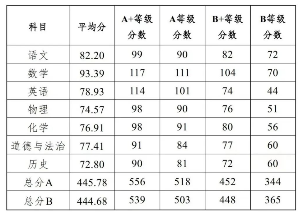 以全市考生为总体样本,初中学业水平考试各科目等级划定比例为A+(10%以内)、A(25%)、B+(25%)、B(20%)、C(20%以下),各科目平均分和等级对应分数具体为