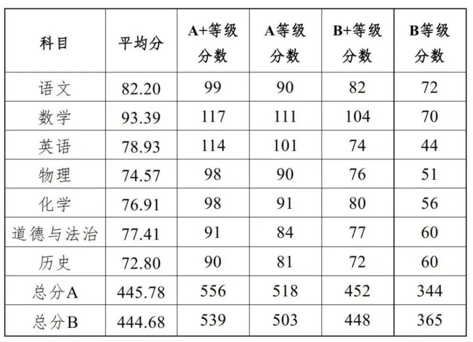 以全市考生为总体样本,初中学业水平考试各科目等级划定比例为A+(10%以内)、A(25%)、B+(25%)、B(20%)、C(20%以下),各科目平均分和等级对应分数具体为