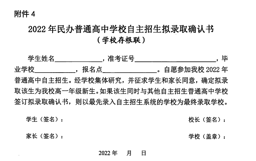 1、自主招生的民办高校须与被录取的学生及其家长签订《民办普通高中学校自主招生拟录取确认书》(学校提供)
