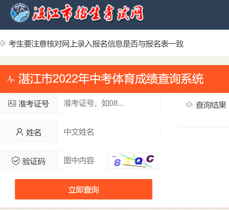 2022年广东湛江中考成绩查询入口开通后,考生可登录湛江市招生考试网(网址:http://zk.jyj.zhanjiang.gov.cn/),输入报名号/考生号、身份证号/姓名、验证码等相关信息后查询中考成绩。