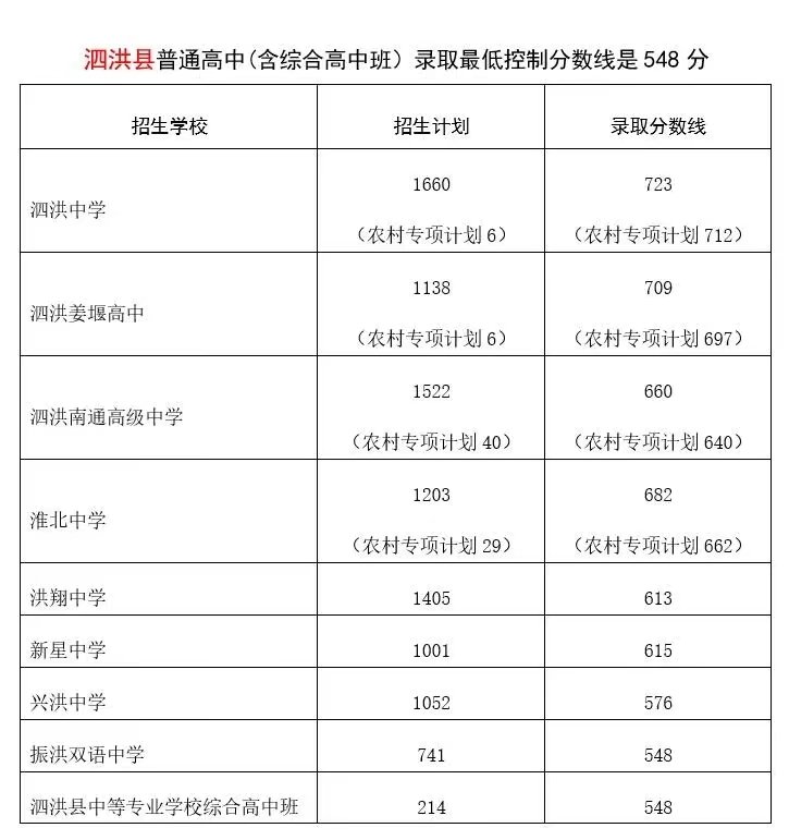四、泗洪县各校录取分数线:
