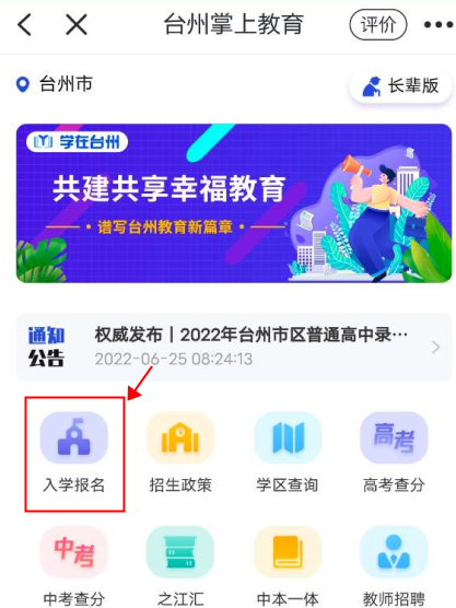 ✔下载安装“浙里办”手机APP,并登录系统,将左上方“站点列表”设置为“浙江省-台州市-路桥区”,搜索“台州掌上教育”,选择“入学报名-儿童入园报名”。