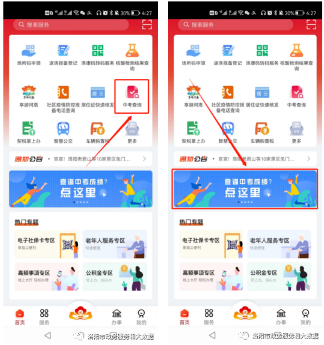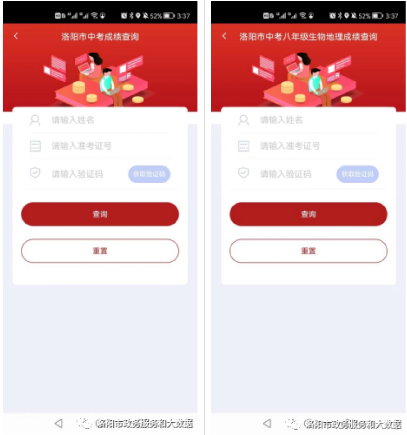 初二、初三考生均可关注洛阳市教育局微信公众号输入姓名、准考证号查询。(所查询成绩不含政策加分)