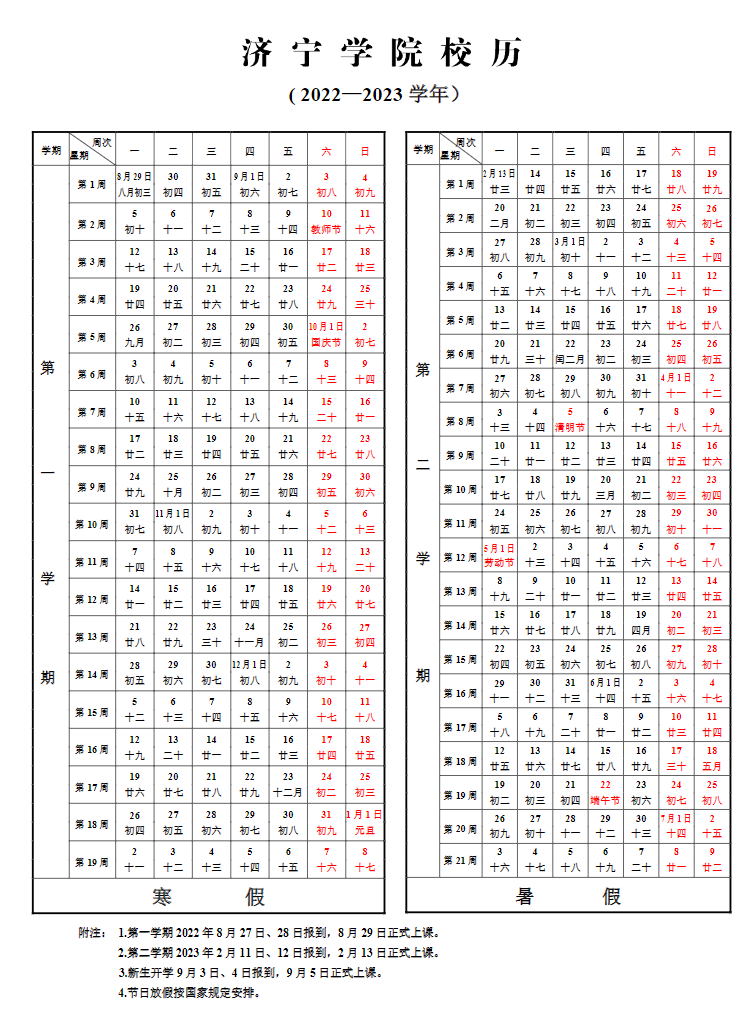 2022-2023济宁学院校历