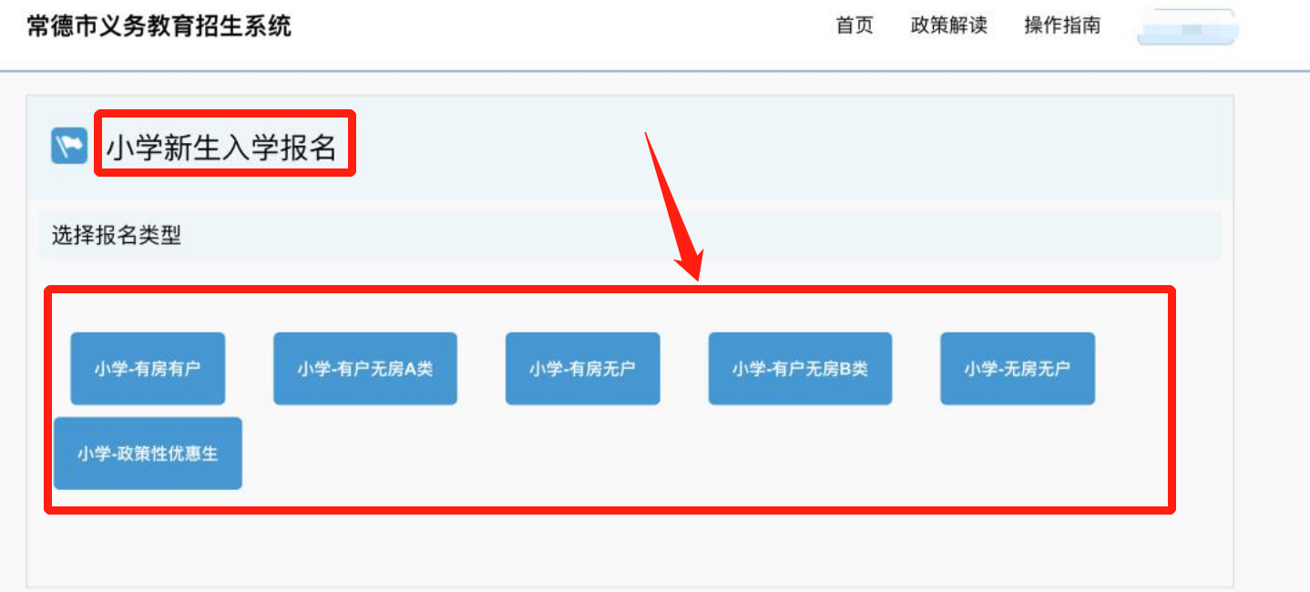 第三步:选择入学区域后,根据实际情况选择报名类型,小学报名类型有:小学-有房有户、小学-有户无房 A 类、小学-有房无户、小学有户无房 B 类、小学-无房无户、小学-政策性优惠生