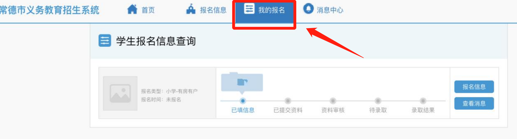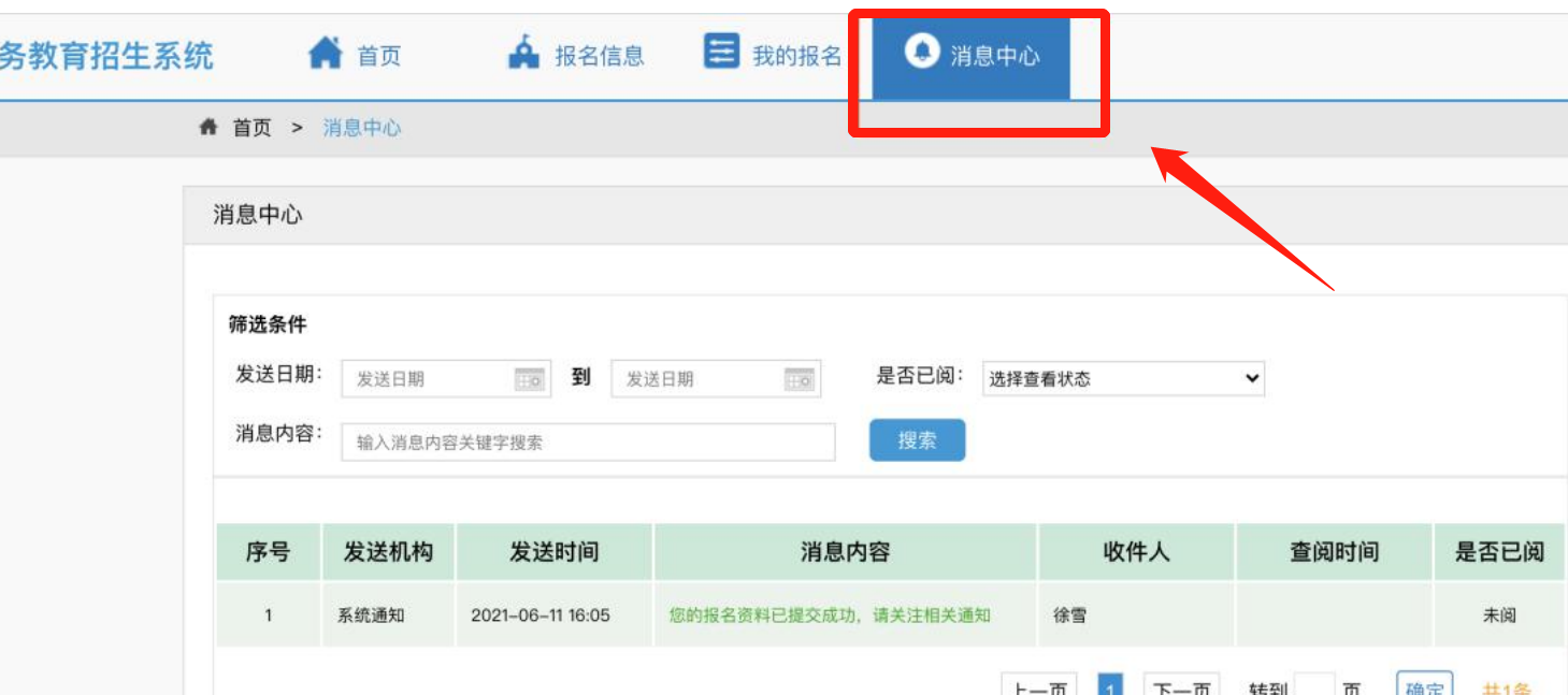第一步:系统的审核结果,家长可以点击【消息中心】,进入消息通知页面,查看系统及其他机构发送的通知消息
