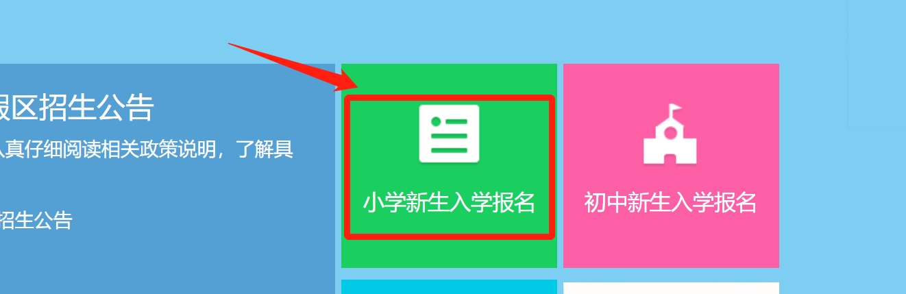 第一步:进入首页后。点击【小学新生入学报名】即可进入报名流程。